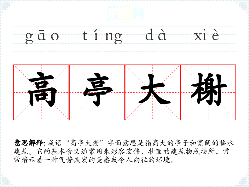 成语“高亭大榭”字面意思是指高大的亭子和宽阔的临水建筑。它的基本含义通常用来形容宏伟、壮丽的建筑物或场所,常常暗示着一种气势恢宏的美感或令人向往的环境。