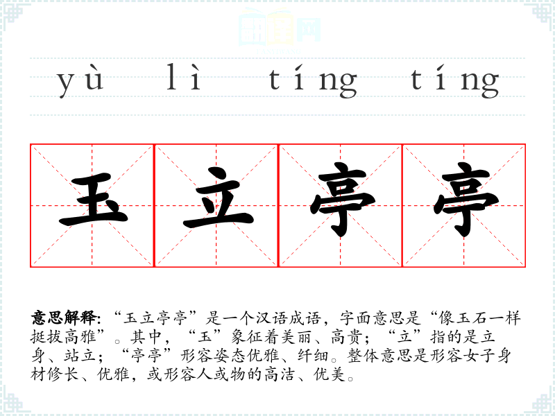 “玉立亭亭”是一个汉语成语,字面意思是“像玉石一样挺拔高雅”。其中,“玉”象征着美丽、高贵;“立”指的是立身、站立;“亭亭”形容姿态优雅、纤细。整体意思是形容女子身材修长、优雅,或形容人或物的高洁、优美。