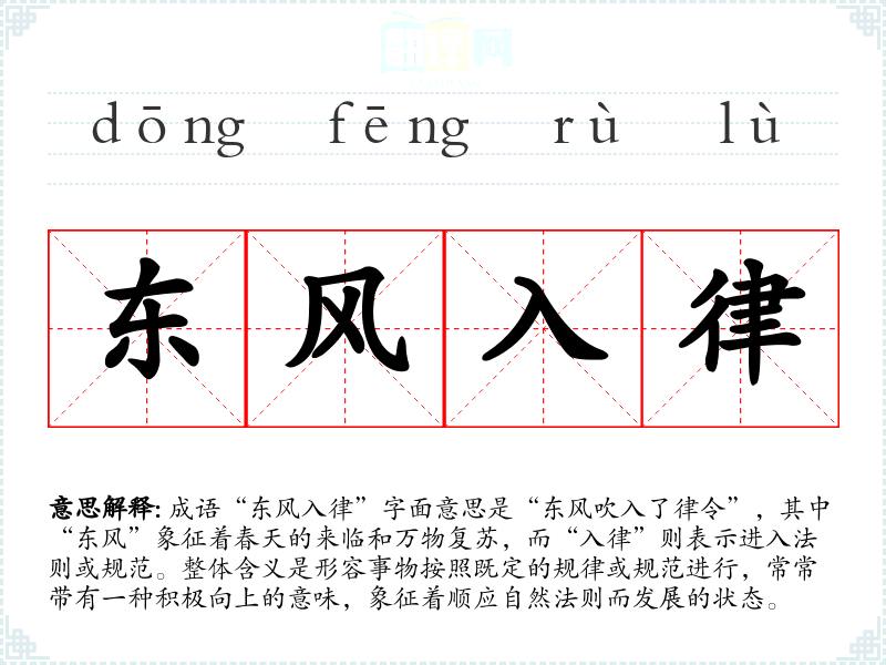 成语“东风入律”字面意思是“东风吹入了律令”,其中“东风”象征着春天的来临和万物复苏,而“入律”则表示进入法则或规范。整体含义是形容事物按照既定的规律或规范进行,常常带有一种积极向上的意味,象征着顺应自然法则而发展的状态。