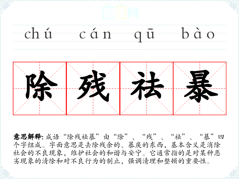 成语“除残祛暴”由“除”、“残”、“祛”、“暴”四个字组成。字面意思是去除残余的、暴戾的东西,基本含义是消除社会的不良现象,维护社会的和谐与安宁。它通常指的是对某种恶劣现象的清除和对不良行为的制止,强调清理和整顿的重要性。
