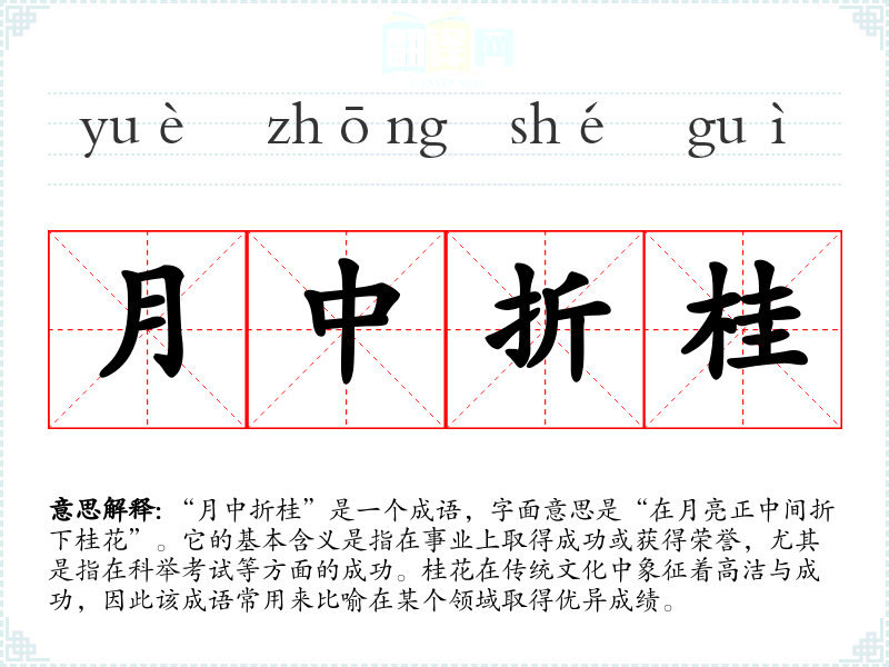 “月中折桂”源于古代的科举制度。传说中,古代文人为了表示对成功的渴望,常常在中秋时节仰望明月,梦想到在月亮的桂树上折下桂花,象征着前途光明和取得功名。这个成语最早可以追溯到唐代,诗人白居易的诗作中就有关于桂花的描写,后世逐渐演变为形容学子获得功名的成语。
