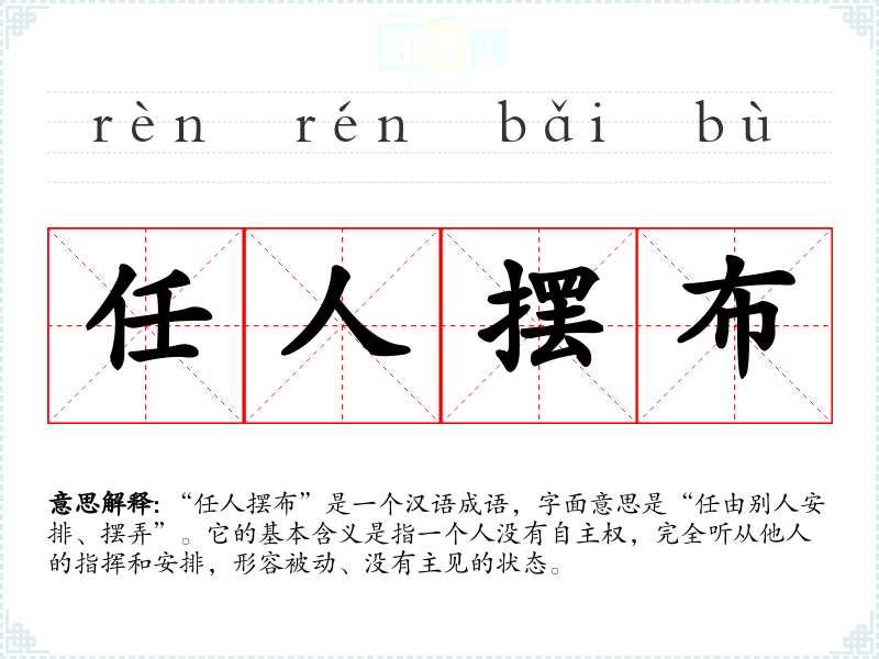 “任人摆布”是一个汉语成语,字面意思是“任由别人安排、摆弄”。它的基本含义是指一个人没有自主权,完全听从他人的指挥和安排,形容被动、没有主见的状态。