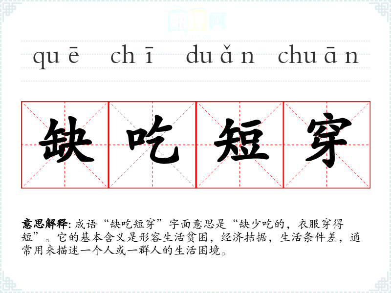 成语“缺吃短穿”字面意思是“缺少吃的,衣服穿得短”。它的基本含义是形容生活贫困,经济拮据,生活条件差,通常用来描述一个人或一群人的生活困境。