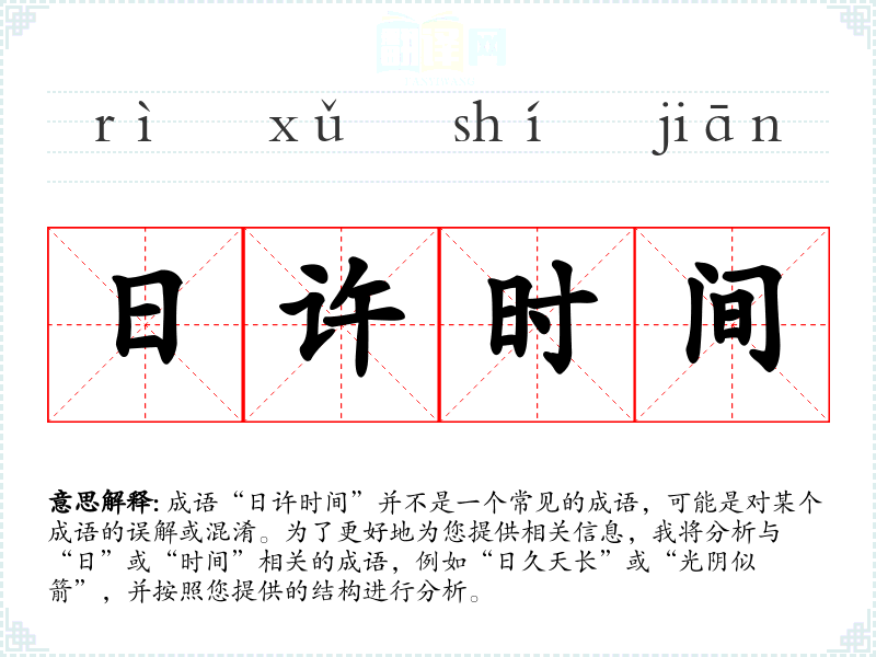 成语“日许时间”并不是一个常见的成语,可能是对某个成语的误解或混淆。为了更好地为您提供相关信息,我将分析与“日”或“时间”相关的成语,例如“日久天长”或“光阴似箭”,并按照您提供的结构进行分析。