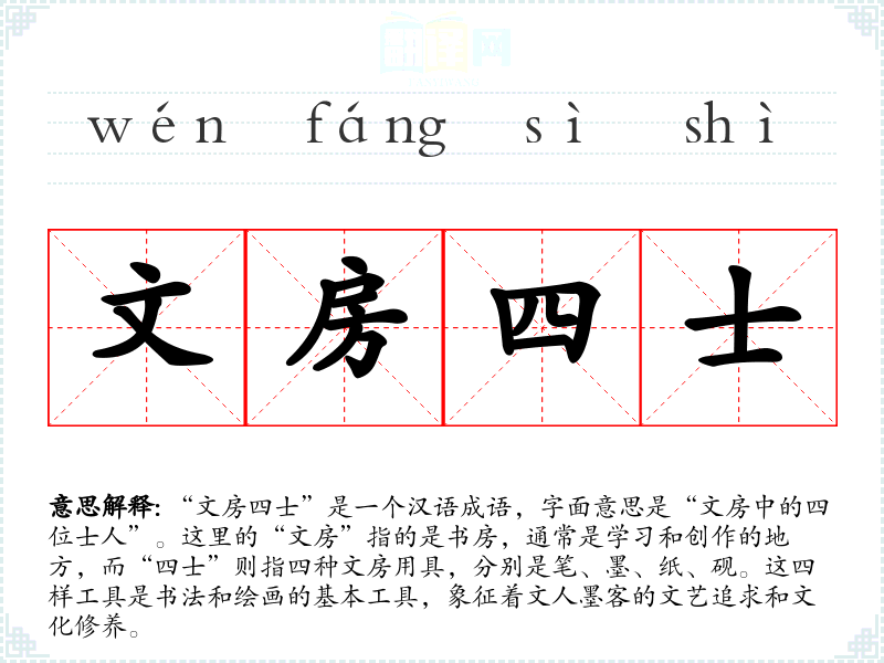 - “文房四宝”:与“文房四士”相似,强调书法所需的四种基本工具(笔、墨、纸、砚)。