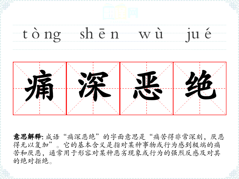 成语“痛深恶绝”的字面意思是“痛苦得非常深刻,厌恶得无以复加”。它的基本含义是指对某种事物或行为感到极端的痛苦和厌恶,通常用于形容对某种恶劣现象或行为的强烈反感及对其的绝对拒绝。