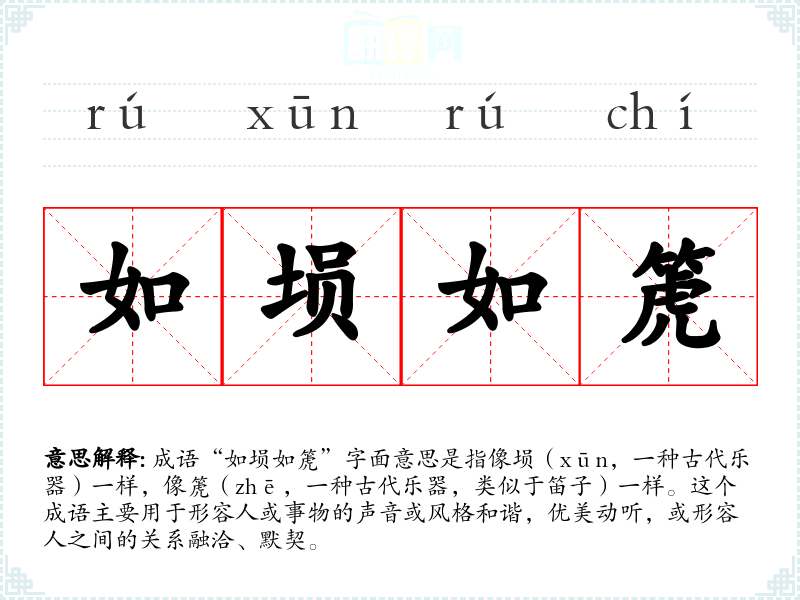 成语“如埙如箎”字面意思是指像埙(xūn,一种古代乐器)一样,像箎(zhē,一种古代乐器,类似于笛子)一样。这个成语主要用于形容人或事物的声音或风格和谐,优美动听,或形容人之间的关系融洽、默契。