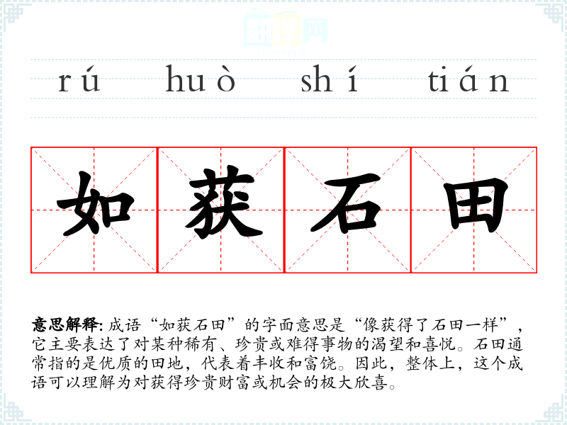 成语“如获石田”的字面意思是“像获得了石田一样”,它主要表达了对某种稀有、珍贵或难得事物的渴望和喜悦。石田通常指的是优质的田地,代表着丰收和富饶。因此,整体上,这个成语可以理解为对获得珍贵财富或机会的极大欣喜。