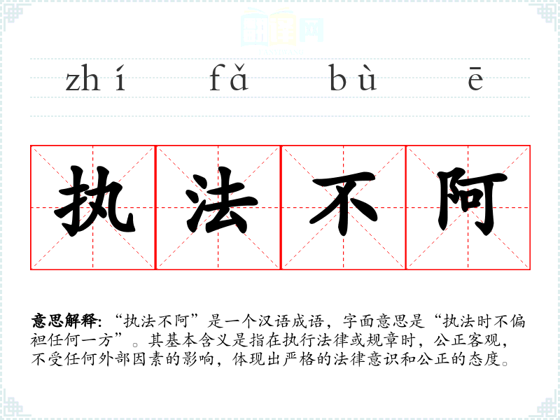 “执法不阿”是一个汉语成语,字面意思是“执法时不偏袒任何一方”。其基本含义是指在执行法律或规章时,公正客观,不受任何外部因素的影响,体现出严格的法律意识和公正的态度。
