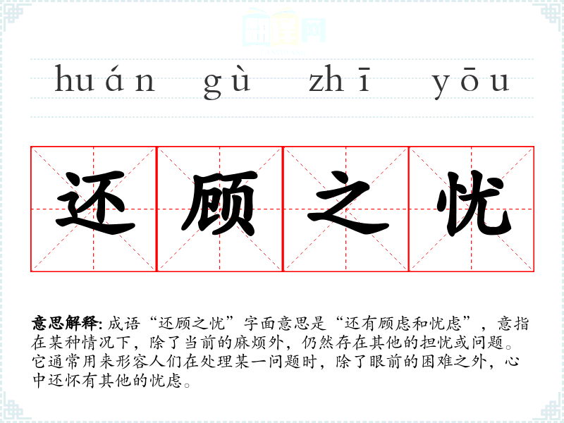 成语“还顾之忧”字面意思是“还有顾虑和忧虑”,意指在某种情况下,除了当前的麻烦外,仍然存在其他的担忧或问题。它通常用来形容人们在处理某一问题时,除了眼前的困难之外,心中还怀有其他的忧虑。