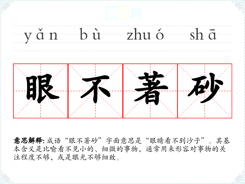 成语“眼不著砂”字面意思是“眼睛看不到沙子”。其基本含义是比喻看不见小的、细微的事物,通常用来形容对事物的关注程度不够,或是眼光不够细致。