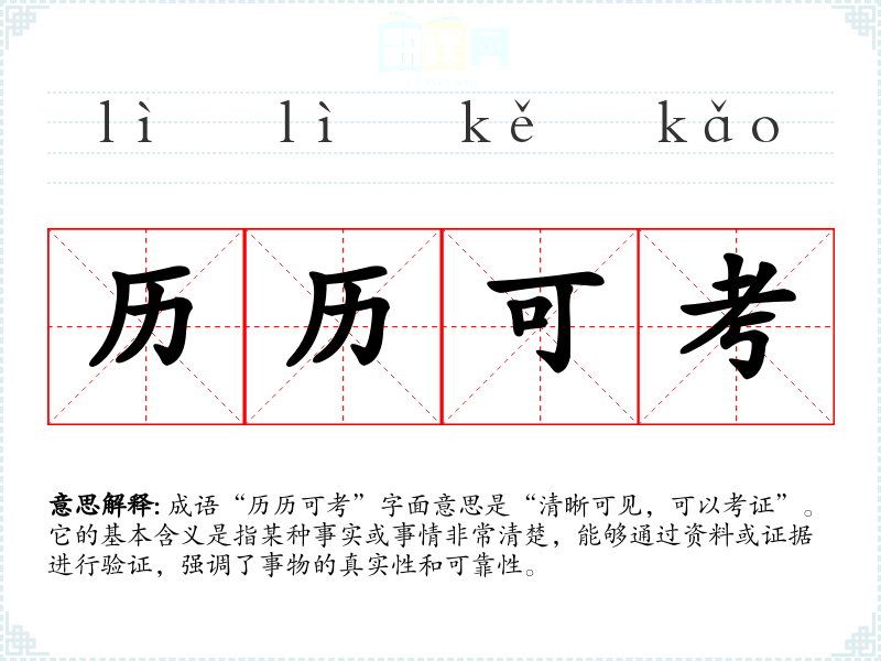 成语“历历可考”字面意思是“清晰可见,可以考证”。它的基本含义是指某种事实或事情非常清楚,能够通过资料或证据进行验证,强调了事物的真实性和可靠性。