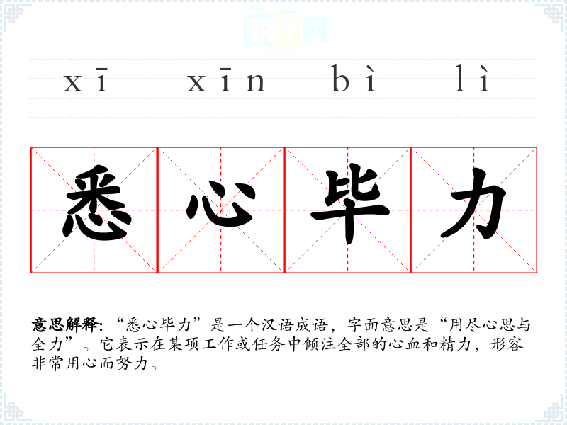 “悉心毕力”是一个汉语成语,字面意思是“用尽心思与全力”。它表示在某项工作或任务中倾注全部的心血和精力,形容非常用心而努力。