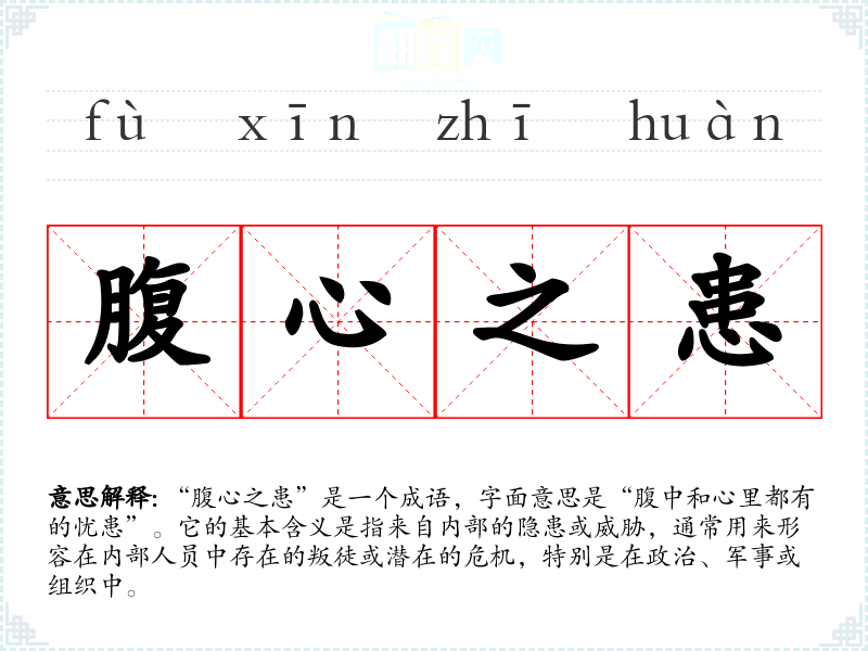 “腹心之患”出自《史记·平原君赵佗传》,其中提到“腹心之患”是指对于国家或组织而言,最危险的敌人往往是内部的叛徒,而非外来的敌人。这一成语反映了古代对内部斗争和内乱的深刻认识。