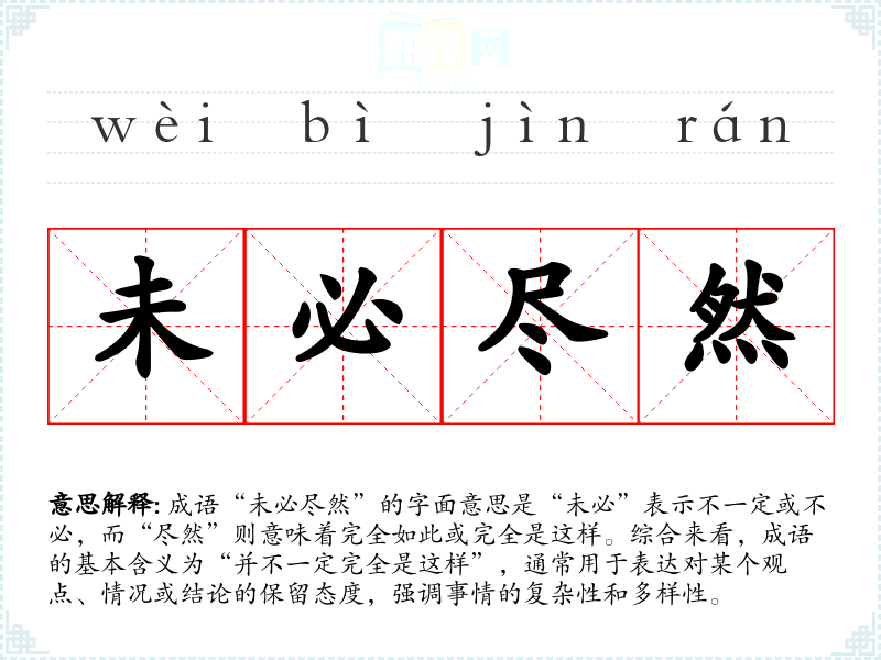 成语“未必尽然”的字面意思是“未必”表示不一定或不必,而“尽然”则意味着完全如此或完全是这样。综合来看,成语的基本含义为“并不一定完全是这样”,通常用于表达对某个观点、情况或结论的保留态度,强调事情的复杂性和多样性。