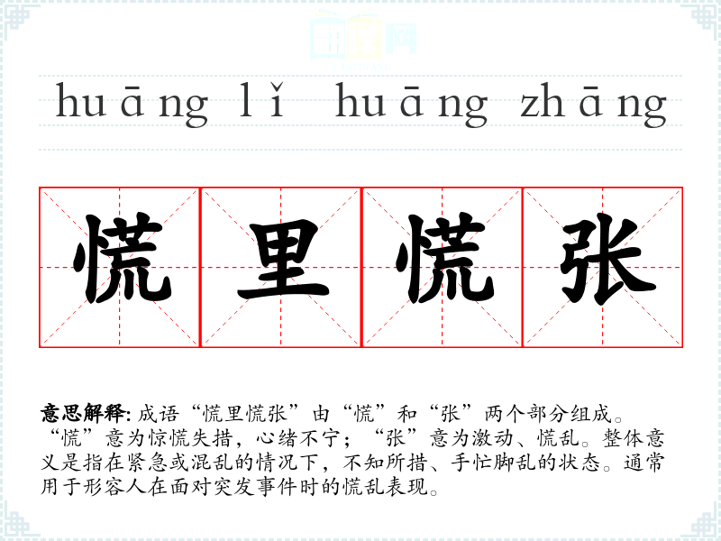 成语“慌里慌张”由“慌”和“张”两个部分组成。“慌”意为惊慌失措,心绪不宁;“张”意为激动、慌乱。整体意义是指在紧急或混乱的情况下,不知所措、手忙脚乱的状态。通常用于形容人在面对突发**时的慌乱表现。