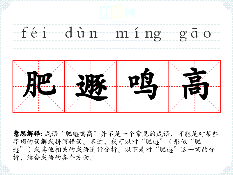 成语“肥遯鸣高”并不是一个常见的成语,可能是对某些字词的误解或拼写错误。不过,我可以对“肥遯”(形似“肥遯”)或其他相关的成语进行分析。以下是对“肥遯”这一词的分析,结合成语的各个方面。