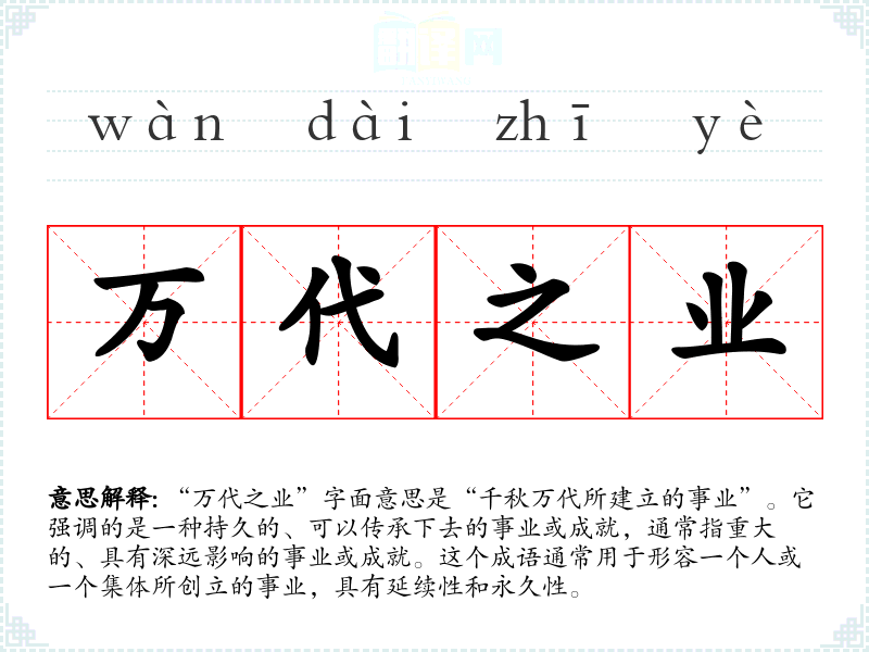 “万代之业”字面意思是“千秋万代所建立的事业”。它强调的是一种持久的、可以传承下去的事业或成就,通常指重大的、具有深远影响的事业或成就。这个成语通常用于形容一个人或一个集体所创立的事业,具有延续性和永久性。