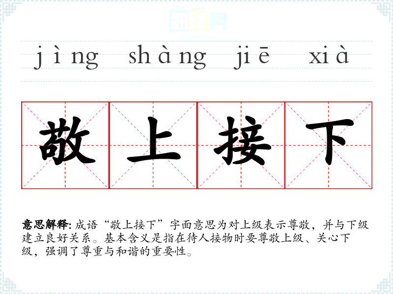 成语“敬上接下”字面意思为对上级表示尊敬,并与下级建立良好关系。基本含义是指在待人接物时要尊敬上级、关心下级,强调了尊重与和谐的重要性。