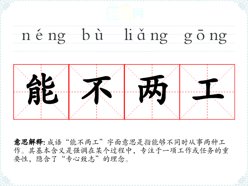 成语“能不两工”字面意思是指能够不同时从事两种工作。其基本含义是强调在某个过程中,专注于一项工作或任务的重要性,隐含了“专心致志”的理念。