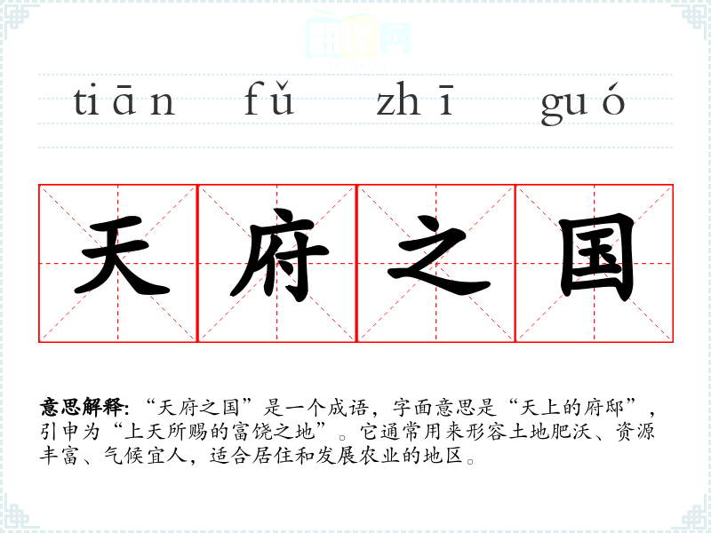 “天府之国”是一个成语,字面意思是“天上的府邸”,引申为“上天所赐的富饶之地”。它通常用来形容土地肥沃、资源丰富、气候宜人,适合居住和发展农业的地区。