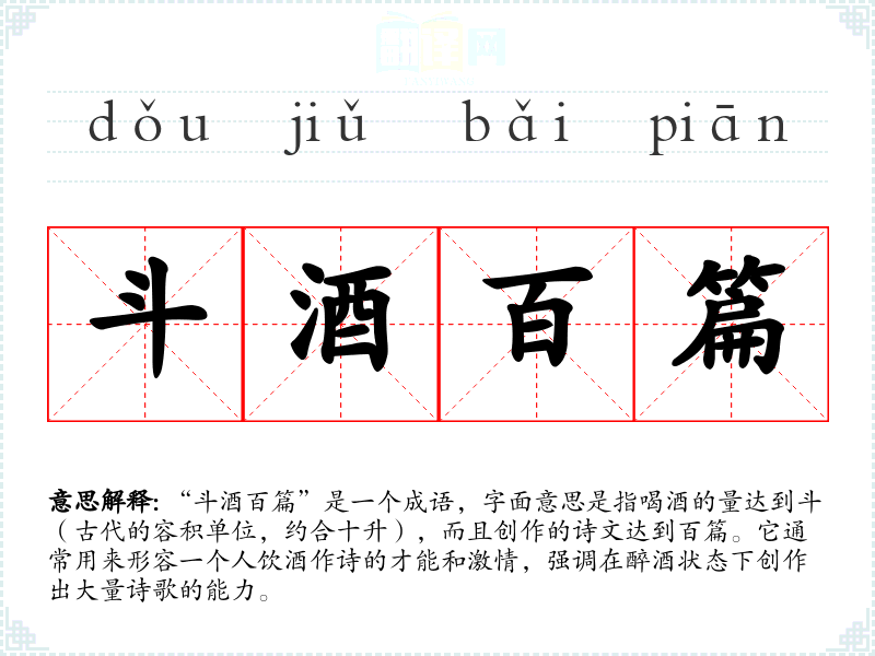 “斗酒百篇”是一个成语,字面意思是指喝酒的量达到斗(古代的容积单位,约合十升),而且创作的诗文达到百篇。它通常用来形容一个人饮酒作诗的才能和激情,强调在醉酒状态下创作出大量诗歌的能力。