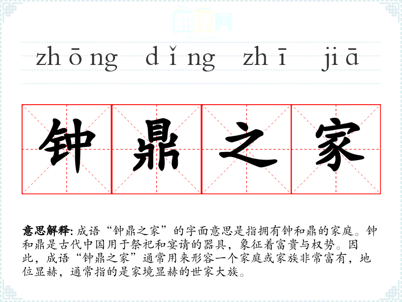 成语“钟鼎之家”的字面意思是指拥有钟和鼎的家庭。钟和鼎是古代**用于祭祀和宴请的器具,象征着富贵与权势。因此,成语“钟鼎之家”通常用来形容一个家庭或家族非常富有,地位显赫,通常指的是家境显赫的世家大族。