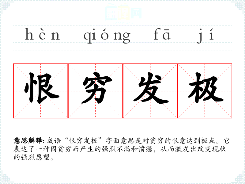 成语“恨穷发极”字面意思是对贫穷的恨意达到极点。它表达了一种因贫穷而产生的强烈不满和愤懑,从而激发出改变现状的强烈愿望。