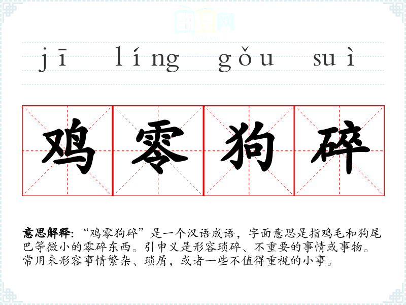 “鸡零狗碎”是一个汉语成语,字面意思是指鸡毛和狗尾巴等微小的零碎东西。引申义是形容琐碎、不重要的事情或事物。常用来形容事情繁杂、琐屑,或者一些不值得重视的小事。