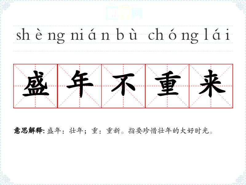 | 盛年不重来 | 盛年:壮年;重:重新。指要珍惜壮年的大好时光。 |