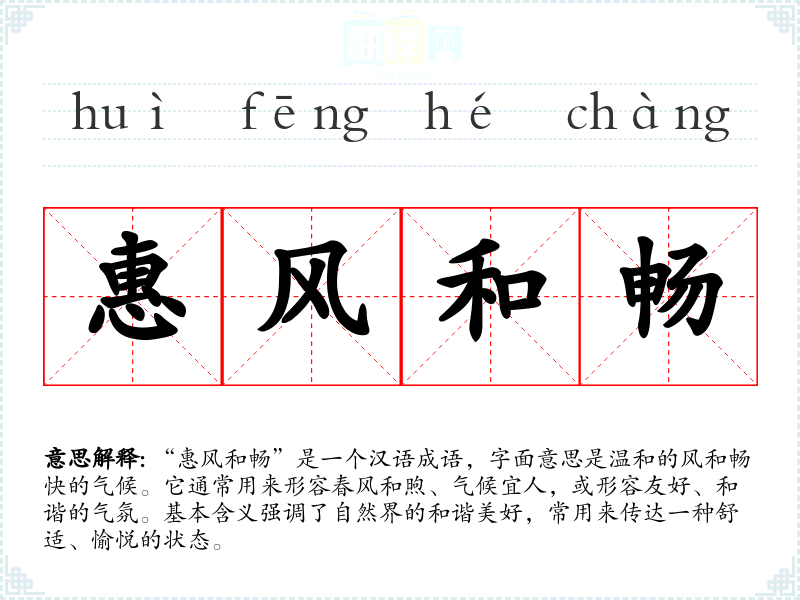 | 惠风和畅 | 惠:柔和;和:温和;畅:舒畅。柔和的风,使人感到温暖、舒适。 |