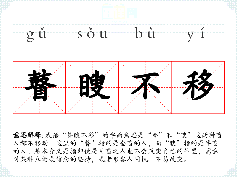 成语“瞽瞍不移”的字面意思是“瞽”和“瞍”这两种盲人都不移动。这里的“瞽”指的是全盲的人,而“瞍”指的是半盲的人。基本含义是指即使是目盲之人也不会改变自己的位置,寓意对某种立场或信念的坚持,或者形容人固执、不易改变。
