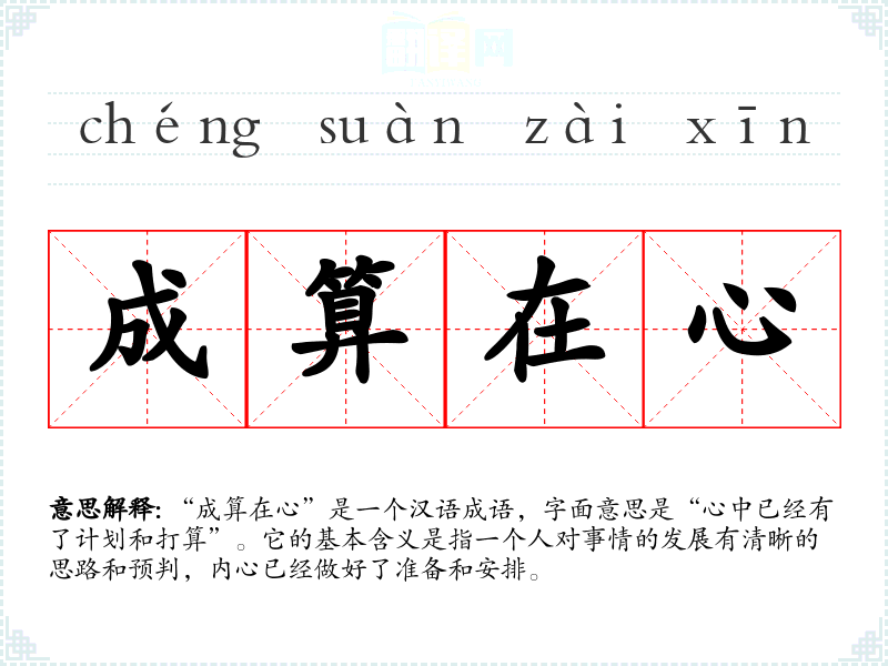 “成算在心”是一个汉语成语,字面意思是“心中已经有了计划和打算”。它的基本含义是指一个人对事情的发展有清晰的思路和预判,内心已经做好了准备和安排。