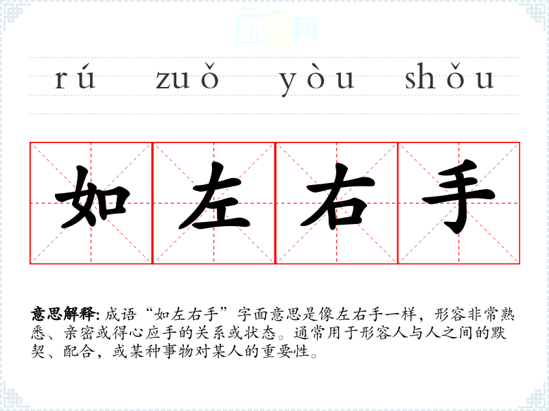 成语“如左右手”字面意思是像左右手一样,形容非常熟悉、亲密或得心应手的关系或状态。通常用于形容人与人之间的默契、配合,或某种事物对某人的重要性。