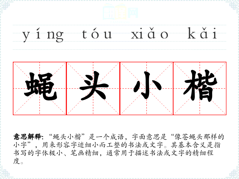 “蝇头小楷”是一个成语,字面意思是“像苍蝇头那样的小字”,用来形容字迹细小而工整的书法或文字。其基本含义是指书写的字体极小、笔画精细,通常用于描述书法或文字的精细程度。