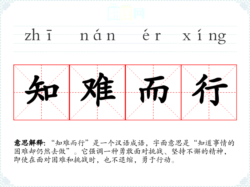 “知难而行”是一个汉语成语,字面意思是“知道事情的困难却仍然去做”。它强调一种勇敢面对挑战、坚持不懈的精神,即使在面对困难和挑战时,也不退缩,勇于行动。