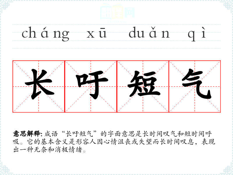成语“长吁短气”的字面意思是长时间叹气和短时间呼吸。它的基本含义是形容人因心情沮丧或失望而长时间叹息,表现出一种无奈和消极情绪。
