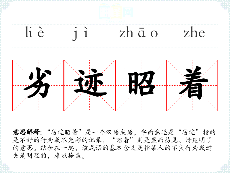 “劣迹昭着”是一个汉语成语,字面意思是“劣迹”指的是不好的行为或不光彩的记录,“昭着”则是显而易见、清楚明了的意思。结合在一起,该成语的基本含义是指某人的不良行为或过失是明显的,难以掩盖。