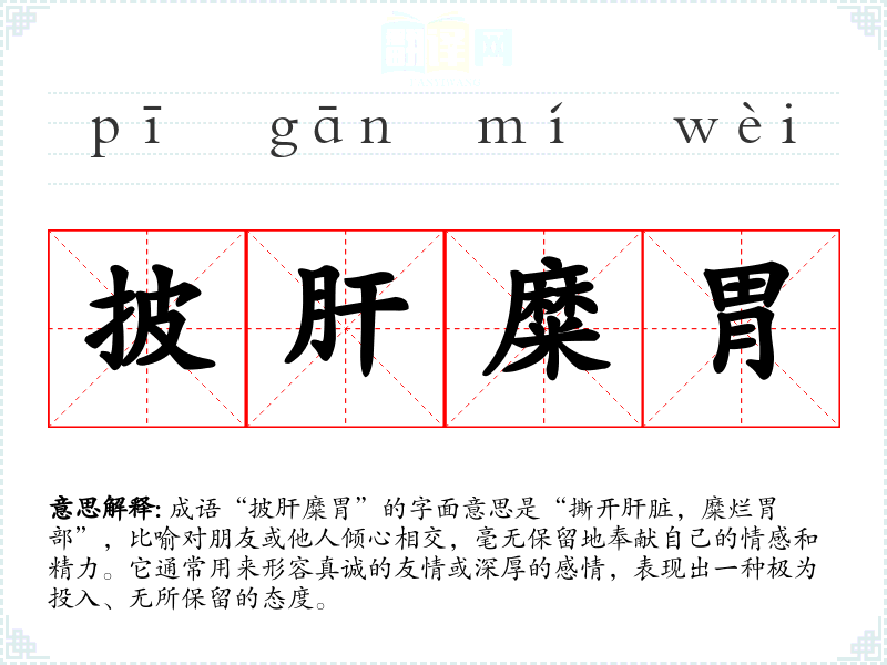 成语“披肝糜胃”的字面意思是“撕开肝脏,糜烂胃部”,比喻对朋友或他人倾心相交,毫无保留地奉献自己的情感和精力。它通常用来形容真诚的友情或深厚的感情,表现出一种极为投入、无所保留的态度。