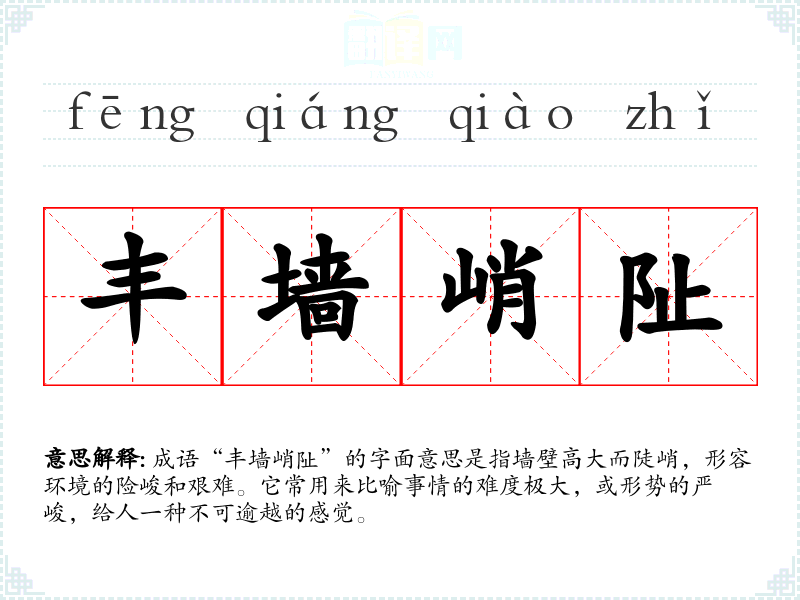 成语“丰墙峭阯”的字面意思是指墙壁高大而陡峭,形容环境的险峻和艰难。它常用来比喻事情的难度极大,或形势的严峻,给人一种不可逾越的感觉。