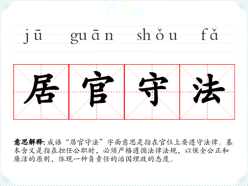 成语“居官守法”字面意思是指在官位上要遵守法律。基本含义是指在担任公职时,必须严格遵循法律法规,以保全公正和廉洁的原则,体现一种负责任的治国理政的态度。