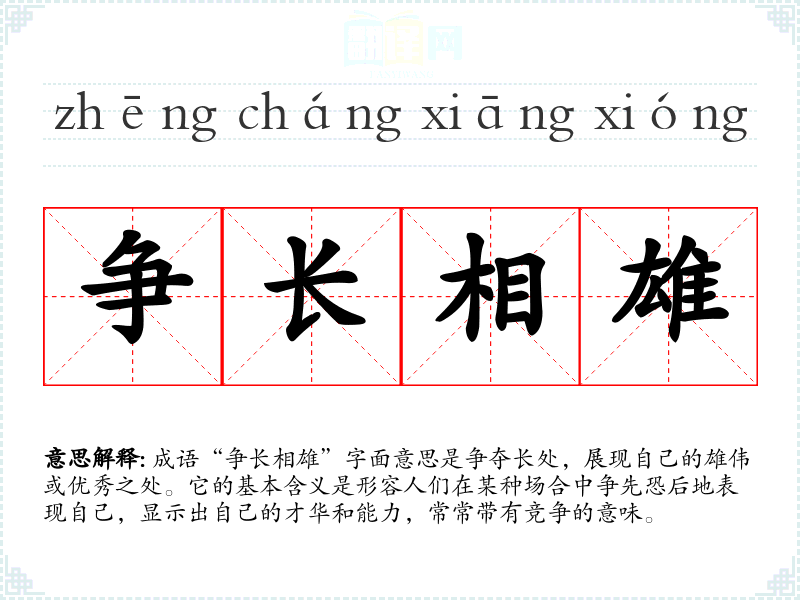 成语“争长相雄”字面意思是争夺长处,展现自己的雄伟或优秀之处。它的基本含义是形容人们在某种场合中争先恐后地表现自己,显示出自己的才华和能力,常常带有竞争的意味。