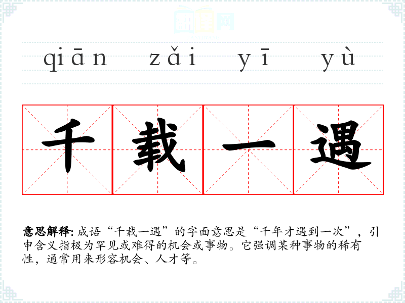成语“千载一遇”的字面意思是“千年才遇到一次”,引申含义指极为罕见或难得的机会或事物。它强调某种事物的稀有性,通常用来形容机会、人才等。