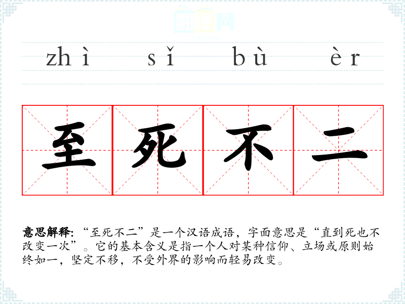 “至死不二”是一个汉语成语,字面意思是“直到死也不改变一次”。它的基本含义是指一个人对某种信仰、立场或原则始终如一,坚定不移,不受外界的影响而轻易改变。