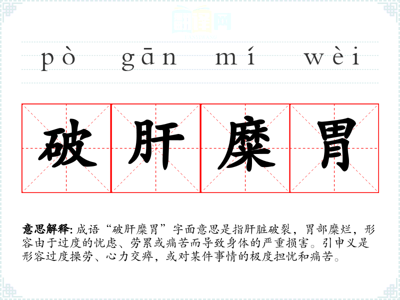 成语“破肝糜胃”字面意思是指肝脏破裂,胃部糜烂,形容由于过度的忧虑、劳累或痛苦而导致身体的严重损害。引申义是形容过度操劳、心力交瘁,或对某件事情的极度担忧和痛苦。