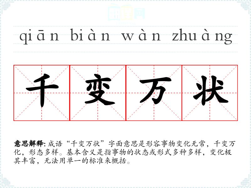 成语“千变万状”字面意思是形容事物变化无常,千变万化,形态多样。基本含义是指事物的状态或形式多种多样,变化极其丰富,无法用单一的标准来概括。