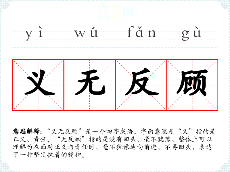 “义无反顾”是一个四字成语,字面意思是“义”指的是正义、责任,“无反顾”指的是没有回头、毫不犹豫。整体上可以理解为在面对正义与责任时,毫不犹豫地向前进,不再回头,表达了一种坚定执着的精神。