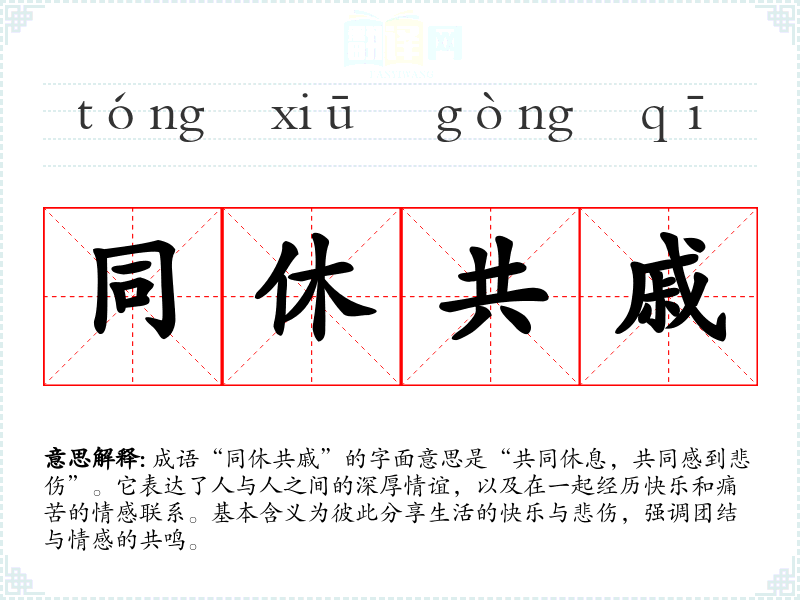 成语“同休共戚”的字面意思是“共同休息,共同感到悲伤”。它表达了人与人之间的深厚情谊,以及在一起经历快乐和痛苦的情感联系。基本含义为彼此分享生活的快乐与悲伤,强调团结与情感的共鸣。