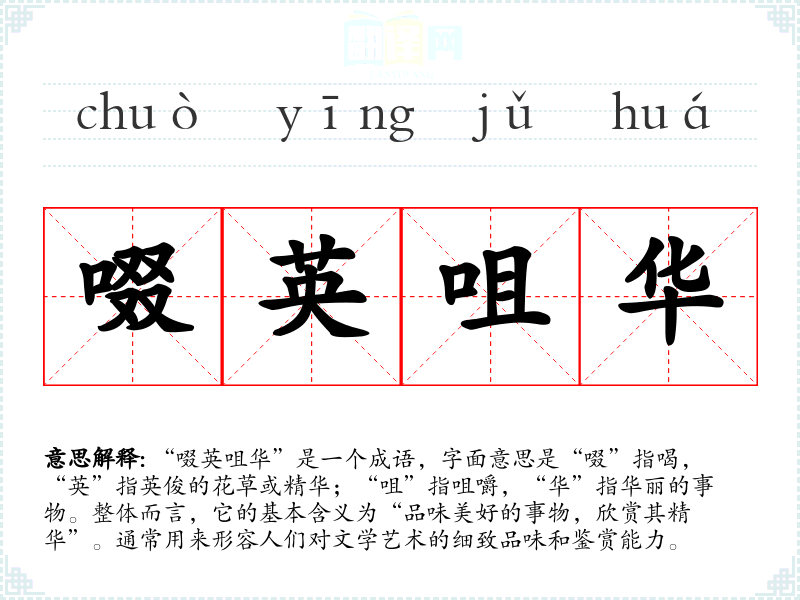 “啜英咀华”是一个成语,字面意思是“啜”指喝,“英”指英俊的花草或精华;“咀”指咀嚼,“华”指华丽的事物。整体而言,它的基本含义为“品味美好的事物,欣赏其精华”。通常用来形容人们对文学艺术的细致品味和鉴赏能力。