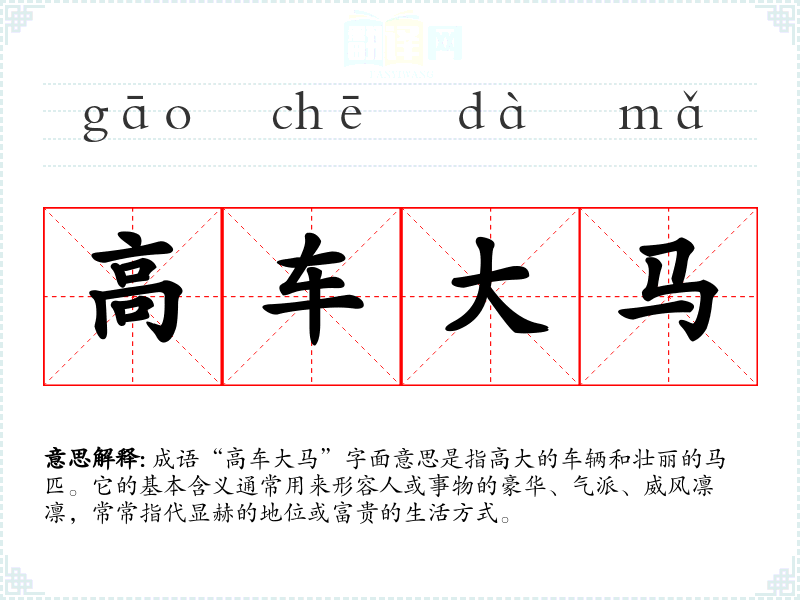 成语“高车大马”字面意思是指高大的车辆和壮丽的马匹。它的基本含义通常用来形容人或事物的豪华、气派、威风凛凛,常常指代显赫的地位或富贵的生活方式。